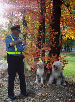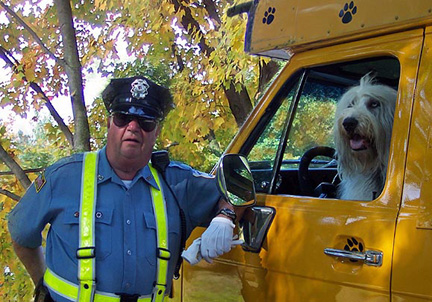 His police radio crackled a message that Cricket and Patrick couldn't understand. Pawficer Andy leaned over to answer it.